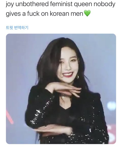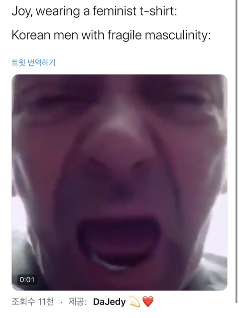 —> 가부장제의 거품이 터질 것 같음을 느낀 한국 남성이 조이가 페미 티셔츠 입은걸로 공격하고 있어