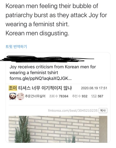+)남초애들 댓글까지 박제당함ㅋㅋㅋㅋㅋㅋㅋ 누가 친절하게 영어로 번역까지 해놓음 판도 글이랑 베댓들 번역됐는데 한국 조이 지지해주는 사람이 많아서 기쁘다고 완전 동의한다네^^