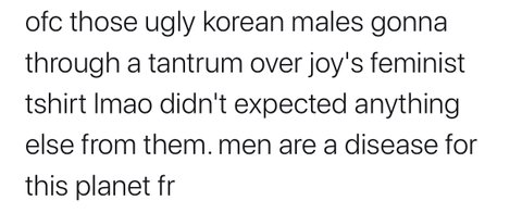 당연히 못생긴 한국남자들은 조이 페미니스트 티셔츠에 열폭하겠지ㅋㅋㅋㅋㅋㅋ 쟤네한테 뭘기대해 남자들은 지구의 질병임ㄹㅇ