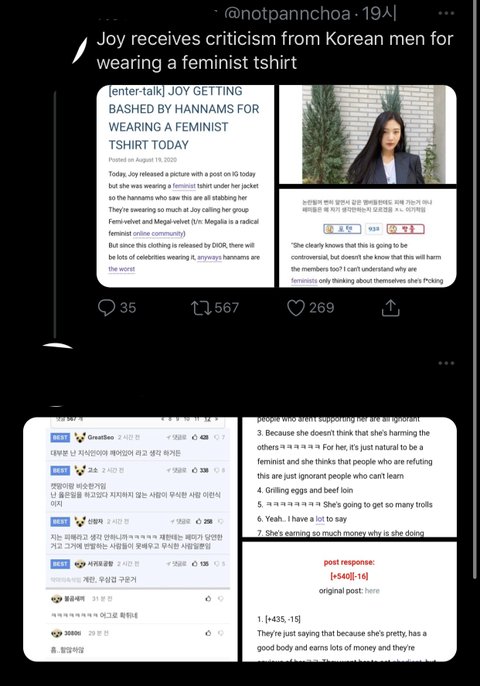 (페미니스트 티셔츠를 입었다고 조이가 한국남성에게 까이고 있다는 트윗)