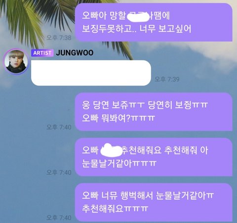 밑에 정우 버블 눈물즈니인데 너무 행복해서 미칠거같아.. 너무 흥분해서 지금 눈물날거같음 과몰입해서 미안한데 과몰입이고 뭐고 진짜 미칠거같아ㅠ