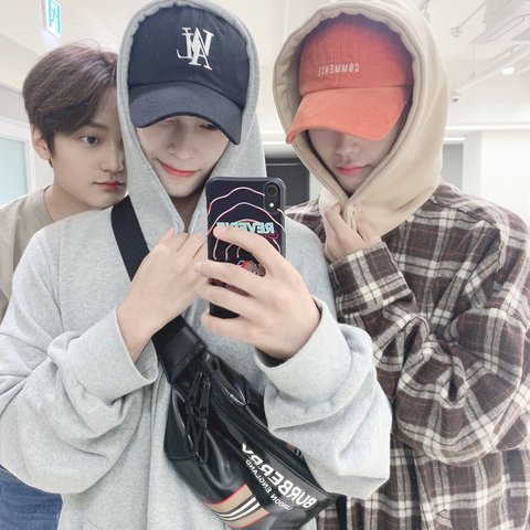 타멤버들과의 셀카에도,, 데뷔 100일 브이앱에도 이러고 등장,, (맨오른쪽 주황모자에요,,)