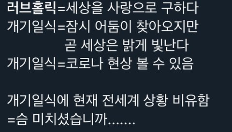 +그니까 개기일식때 코로나라는 질병이 아니라 자연현상을 관측할수 있는데 스엠을 이름같은걸 알고 천재적으로 갖다쓴거임 개소름....