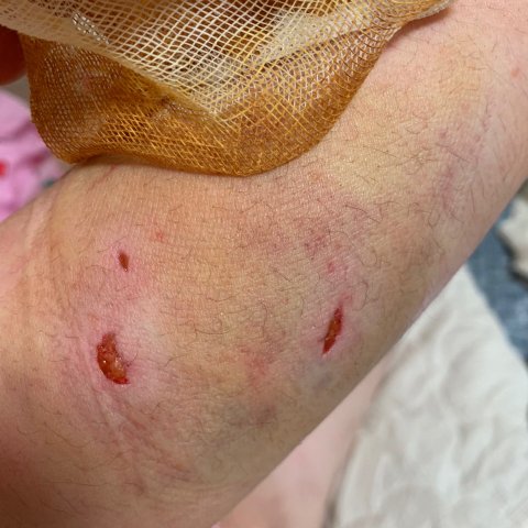 저희집 반려견과 산책하다 맞은편에서 오는 6키로 이상10키로 미만인 중형견(사진 에서 보이는 왼쪽 강아지)에게 팔뚝을 물려 전치3주 진단과