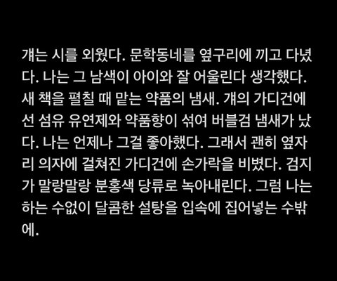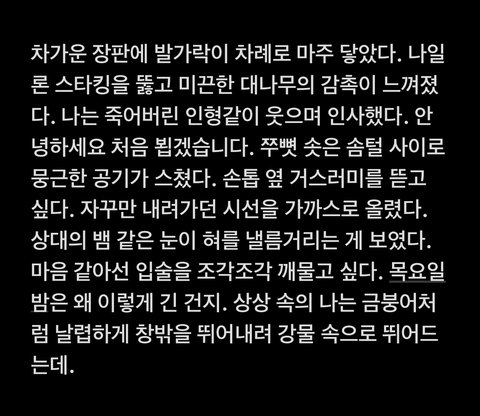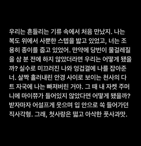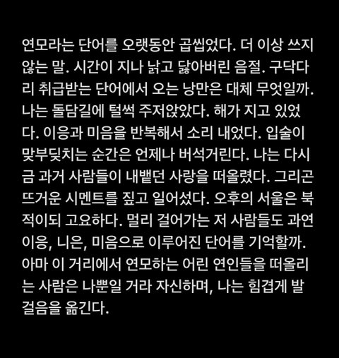 나는 글쓰기랑 거리가 먼 삶을 살아가고 있는 사람이야! 글을 배워본 적도 없고, 끈기가 없어서 오랜 템포의 글을 써본 적도 없어 ㅎㅎ 최대한 바로바로 적으려 노력하는데 원래 글을 천천히 쓰는 타입이라 최선을 다해도 시간이 좀 걸리더라. 전체적으로 빨리빨리 써내리는 글이란 점 양해해줘! 내 글 좋아해주는 사람이 많아서 너무 행복하다 ㅜㅜ 게시글 읽는 모두들 기분 좋은 금요일 됐으면!!