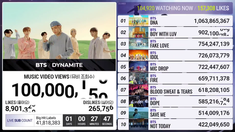 방탄 다이너마이트 다들 어때? +)) 조회수 1억뷰 돌파!!