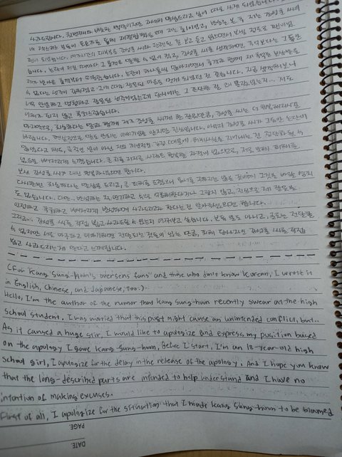 (+ 억지로 쓰는 게 글씨에서부터 티난다는 분 많은데, 억지로 쓴거절대 아니고 진심이고 글씨체도 신경 쓴다고 쓴 건데 그렇게 보인다면 노력하겠습니다. 그리고 댓글중에 이것도 선처받으려는 거 아니냐고, 강성훈 씨 만나도 선처해달라고밖에 더하겠냐는 내용도 보이는데 바라지도 않습니다. 고소장도 도착 안한 상태라 어찌 될지는 가봐야 알겠지만 처벌 크면 큰 대로 작으면 작은대로 달게 받을 거고요.. 애초에 만나서 사과드리고 싶다고 쓴건 저도 성사 가능성이 0에 가깝다는 거 알지만 적어본 거고 진짜 만약에 뵙는다 해도 선처의 선 자도 꺼낼 생각 없습니다.)