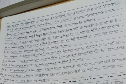 (+ 관심에 목말라서 올린 것도 전혀 아닙니다. 자필 사과문을 쓸 생각은 저도 어느정도 있었고, 고민하던 차에 팬분들 중에 DM으로 자필 사과문 얘기 꺼내신 분이 계셔서 쓰게 된 겁니다. 그리고 말투 다른 건 주작 글에서는 음슴체로 썼지만, 이 글은 웃고 떠들 목적이 아닌 만큼 존댓말로 바꾼 겁니다.)