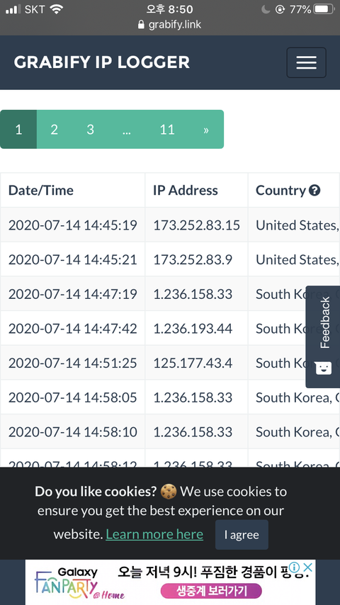 4. 해당 페이지를 아래로 내리다 보면 시간대와 함께 아이피 주소랑 누르면 통신사, 폰 기종이 나와 위치는 간략하게 떠 unitedstates 라 뜰 때가 있는데 우리가 전문 해커는 아니니까 정확하게 알 수 없어 하지만 폰 기종이랑 통신사는 정확하다고 볼 수 있어 아이피를 따면 구글링 하면 위치를 알 수 있지만 거의 정확하지 않아