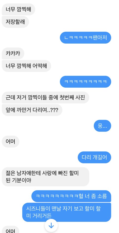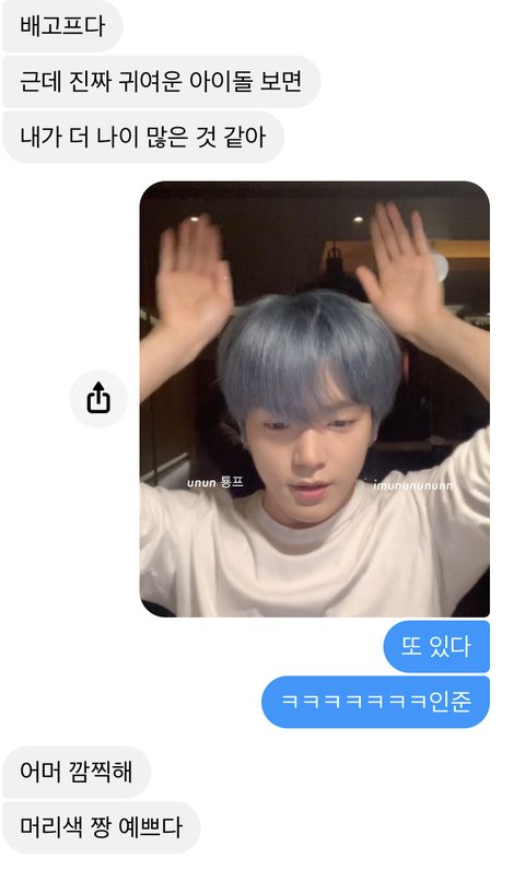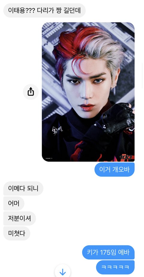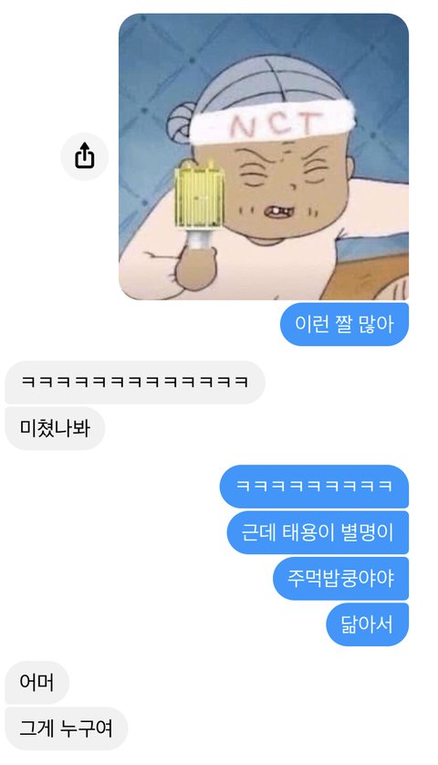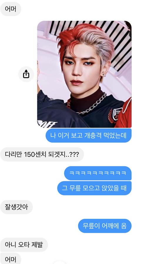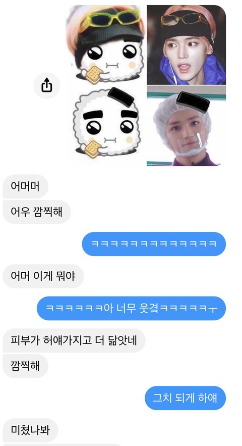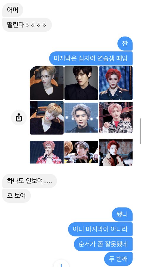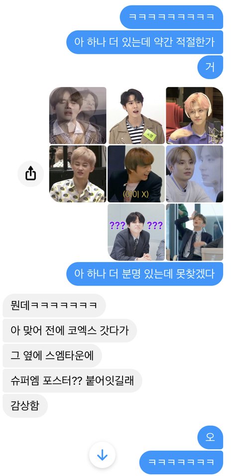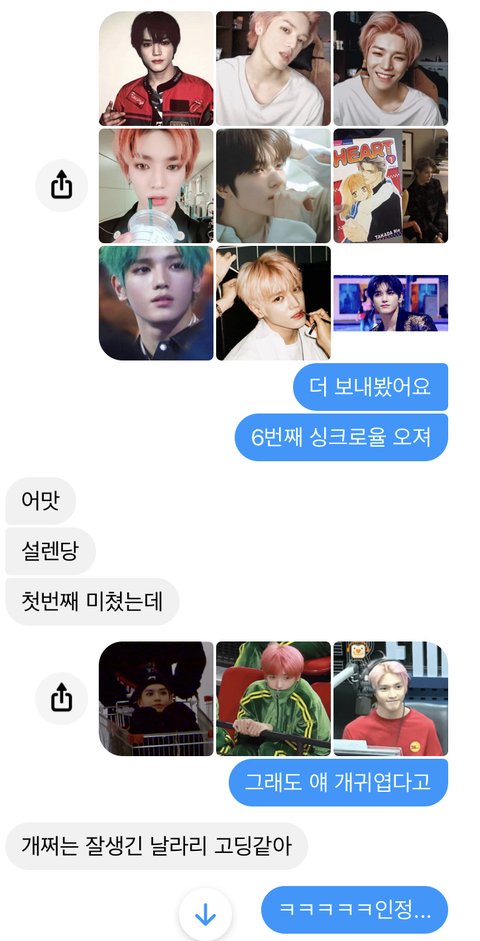진짜 혐생 얘기하다가 짜증내는 엔시티 짤 모아서 보냈는데 어쩌다 보니 슈빠엠 얘기가 나옴... 그러다 보니 짤 와다다 보냈는데 ㅋㅋㅋㅋㅋㅋ 입덕할 것 같대 자기 할미라는 거 웃겨 죽을 뻔.. 거의 시즈니 아니냐며