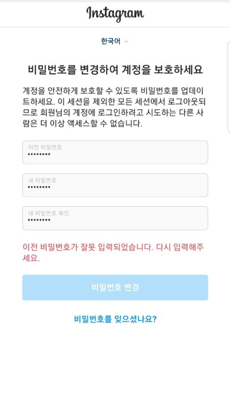비밀번호 변경 버튼을 누르고서 예전 비밀번호랑 바꿀 비밀번호를 입력했음