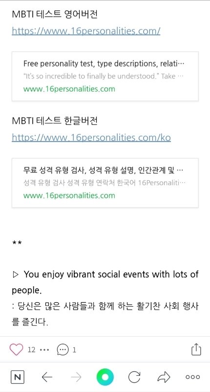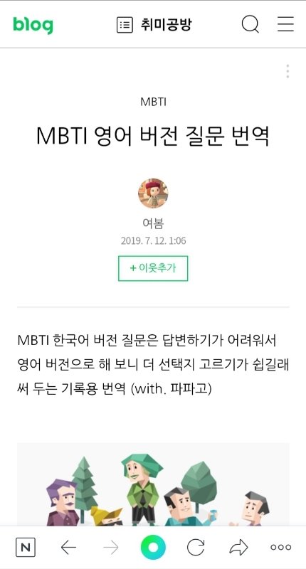 한국어로 번역된 버전은 이게 뭔소린가 싶은거 많잖아 그리고 잘못 번역된 의미의 질문들도 꽤 많더라고ㅇㅇ... 근데 영문 버전은 그런거 전혀 없어서 고르기 수월하더라 그래서 영문으로 할때랑 한국어로 할때랑 mbti가 다르게 나오더라 영문 버전이 더 나한테 맞는것 같다고 느낌 난 아래 블로그 보면서 했음