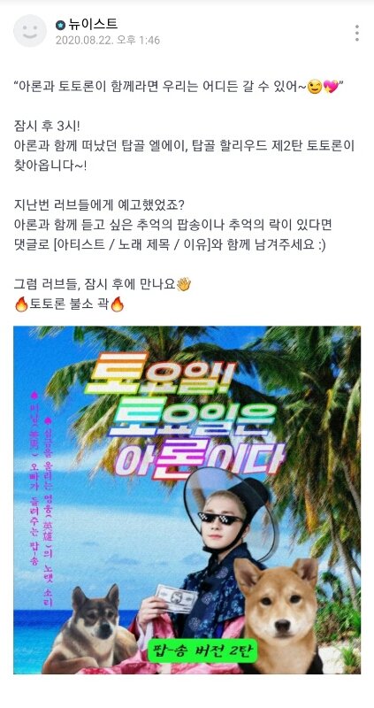 뚜둥!! 오늘 오후 3시! 기다리고 고대하던 토토론이 온다!! 브야들이 듣고싶은 팝송이나 락을 신청해주라꼬☺ https://channels.vlive.tv/F59133/celeb/0.16765265