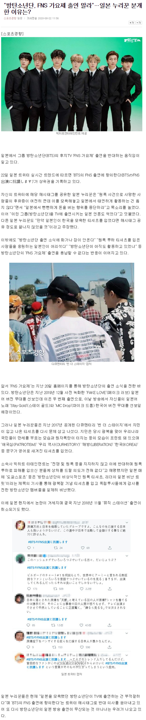 "방탄소년단, FNS 가요제 출연 말라"…일본 누리꾼 분개한 이유는?