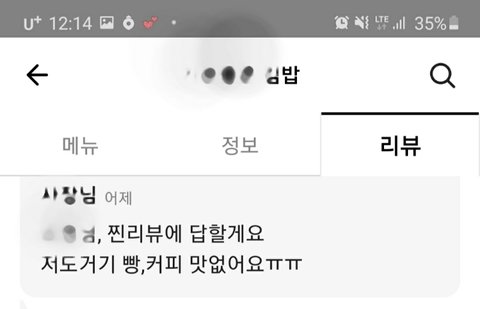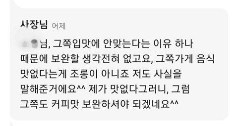 저희 커피랑 빵도 별로라고 댓글을 다신거에요 기분이 너무 나빠서 하루종일 신경쓰이고 화가 났어요 댓글 또 달고 그랬는데 제가 잘못한건가요? 보통 사장님들이 저렇게 댓글을 다시는게 맞는건가요?
