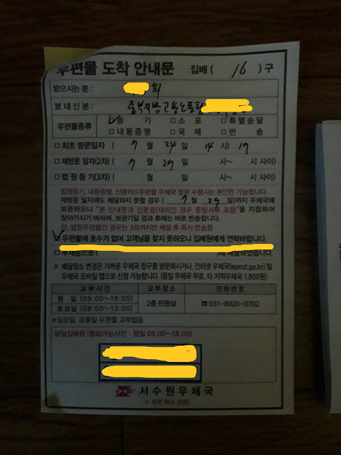 7/24일 저는 집에 있었는데 등기가 반송되었다는 우체국의 안내문이 현관 출입구에 붙여져 있더군요... 이를 보고 우체국 담당자와 우체국에 전화를 해서 어떻게 된 건지 문의를 했습니다.[통화내용녹음] 등기에 저의 연락처도 집호수도 적혀있지 않아서 반송이 되었다 하시더군요..