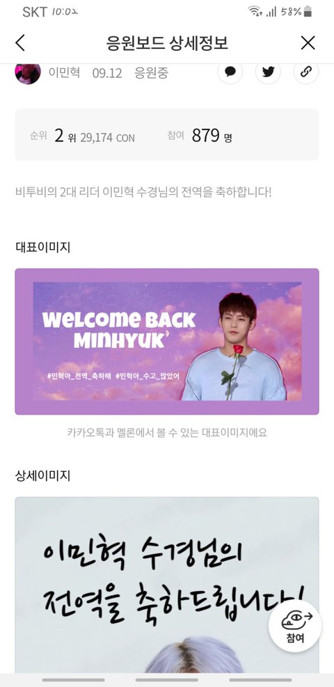 9월 12일 민혁오빠 전역하잖아 어떤 멜로디분이 카카오톡 응원보드에 이민혁 전역기념 응원보드를 올리셨더라구