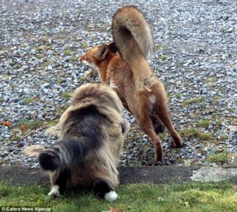그러나 오래 안가 곧바로 노르웨이 숲 고양이가 반격하고 되려 여우는 기겁하고 달아났음