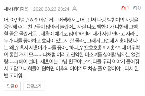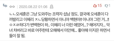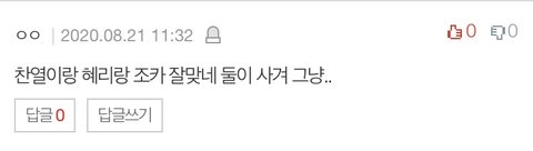 이 댓글들 너무 정확해서 우리 뜨지 말라고 추천도 안 눌렀는데 추천이 많이 눌러졌더라.. 이거 댓글 보면서 우리 엄청 쫄렸음ㅋㅋㅋㅋ 우린 나름 찬열이 혜리 좋아하는 게 큰 반전이라 생각했거든 사실 처음 설정이 찬열이 지은이 좋아하던 설정인데ㅋㅋㅋ 혜리랑 찬열이 둘이 지은이 꼽 주는데 생각보다 잘 어울려서 스토리 바꿈 아!! 너네도 잘 어울린다고 생각 했구나? 냐학학핛학!!!