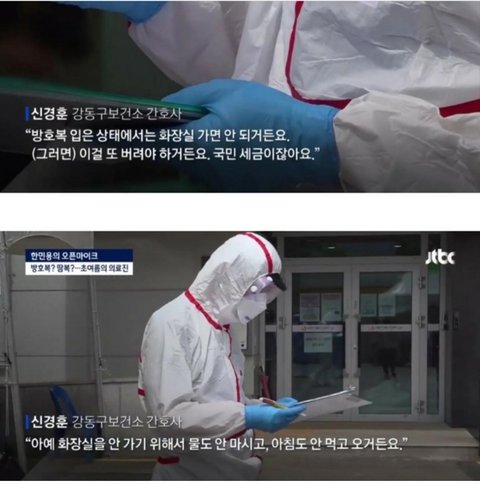 저희 사촌 오빠가 의사인데 얼마전에 본 사촌오빠 얼굴이 많이 지친 것 같더라구요 SNS도 자주하던 오빠였는데 요즘은 글도 올리지 않고 힘들지 않냐니까 많이 힘들다ㅋㅋ 하던게 잊히지않더라구요 또 인터넷에서 본 사진인데 어느 의료진 분이 "방호복을 입은 상태에선 화장실도 가지않는다. 가면 방호복을 버려야하는데 이것도 다 국민들의 세금이다. 그래서 일부러 화장실을 가지 않도록 물도 안마시고 아침에 아무것도 먹지않고 온다" 라는 말을 하시더라구요 그 사진을 보고 괜히 제가 다 죄송스러워지는 마음이 들기도 하더라구요