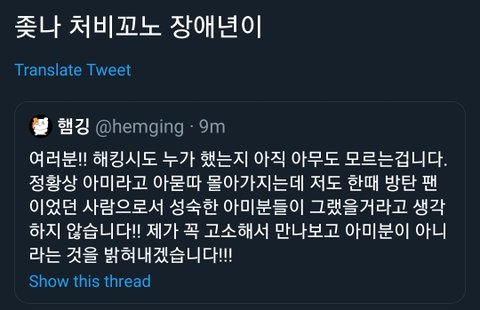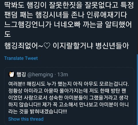 ㅅㅂ 게다가 저거 햄깅이 만든 문장도 아니고 전부터 짤로 유명하던 대사였잖아 진짜... 별걸 다 ㅂㅌ이랑 연관짓네 짜증남 아예 군인들도 다 아미라고 하지 그러냐 양심이 있어서 거기까진 안 하나