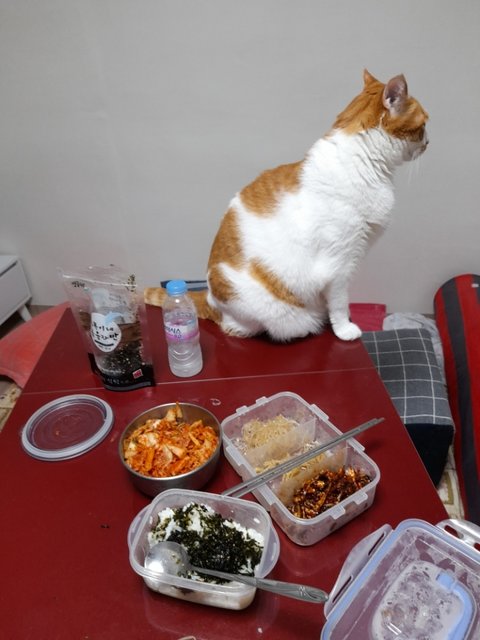 집사가 점심 잘못 먹어 속도 안좋고 입맛도 없어서 밥에 물말아서 대충 먹고 있었음.