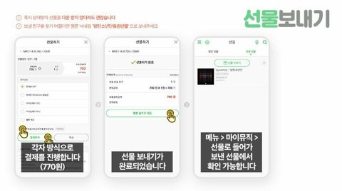 * 메뉴 > 마이뮤직 > 선물로 들어가 보낸 선물에서 확인 가능