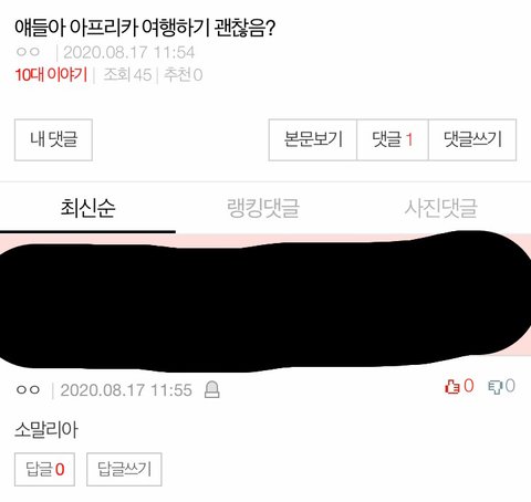 난 개인적으로 이거... 아프리카에서 여행가기 좋은 곳 추천해달라고 했는데 누가 소말리아라고 함... 참고로 소말리아는 아프리카 여행제한구역임...(치안이나 범죄가 개심함 ㄹㅇ 상상초월) 화장뷰티틴트