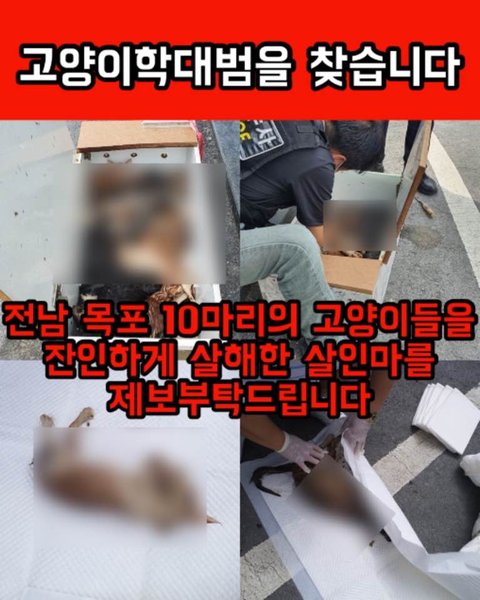 무더기로 죽은 아이들의 사체를, 보란 듯이 고양이 보호쉼터 앞에 놔두는 극악무도한 짓을 한 이 학대범을 용서할 수가 없습니다 ㅠㅠㅠㅠ 목포 용당동에 거주하시는 분들 중에 이 시각에 혹시 목격하신 분들이 있다면 제보 부탁드립니다..