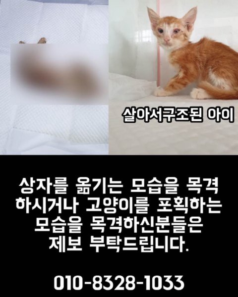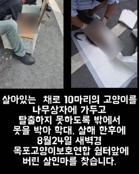 이 잔인한 놈을 잡을 수 있도록 여러분이 도와주세요. 8월 24일(월) 새벽 3시부터 새벽 6시 30분 경에 목포고양이보호연합 쉼터 앞에 이 상자를 버린 모습을 목격하신 분들의 제보 부탁드립니다.