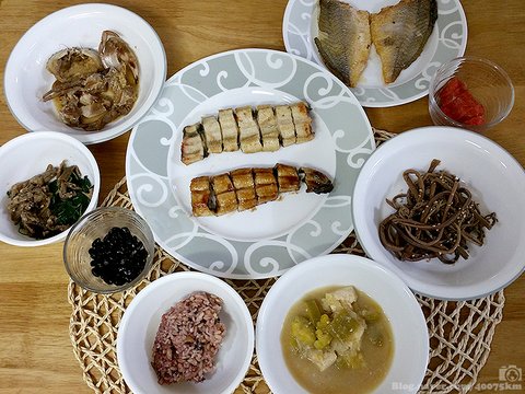 (잡곡밥, 두부 된장국, 검은콩자반, 비름나물, 고사리무침, 장어구이, 마트표 돌게간장게장, 생선구이, 마트표 명란젓)
