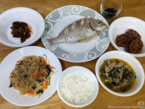 (쌀밥, 마트표 해장국, 잡채, 도미찜, 연근조림, 검은콩자반, 마트표 갓김치)