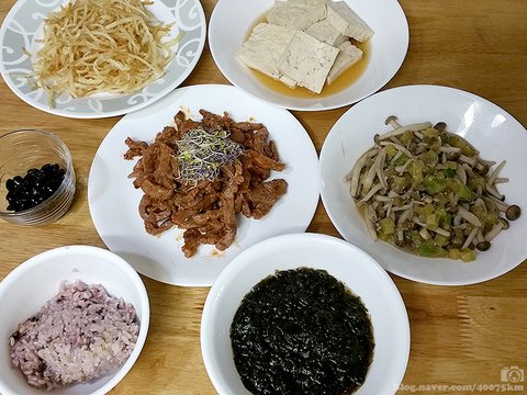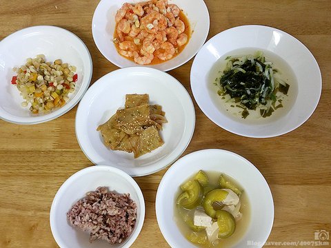(잡곡밥, 두부된장국, 멸치볶음, 검은콩자반, 비름나물 무침, 토란대 무침, 어묵게맛살 볶음, 새우 칠리소스 볶음, 샐러리와 방울토마토)
