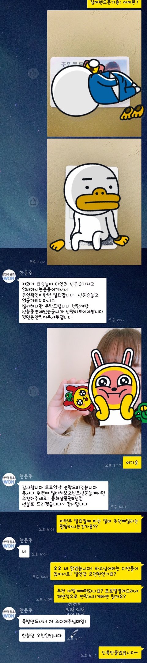 그래서 남자친구한테도 말하고 주변친구들한테도 그래도 나 하루짜리 알바 구했다고 말하니 본인들도 하고 싶다고 하더라고요... 근데 제가 직접 구한 알바도 아니고 아는 동생 통해서 하는 알바라 꽂아 줄 수는 없다했는데,, 마침 그 담당자가 알바 더 필요하다고 할 사람있냐고 묻더군요. 소정의 선물로 인당 문상5천원씩 준다고... 여기서 눈치 챘어야했는데 ㅠㅠ