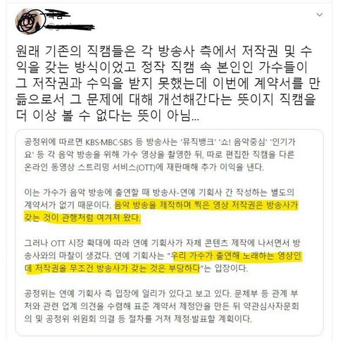 공정위에서 직캠도 아이돌 업무로 보고 수익분배하라고 결정났대 방송국은 돈내면서까지 직캠 올릴순 없어서 하나씩 내리는중인가봐 빨리다운받던가 녹화해놔야겠어