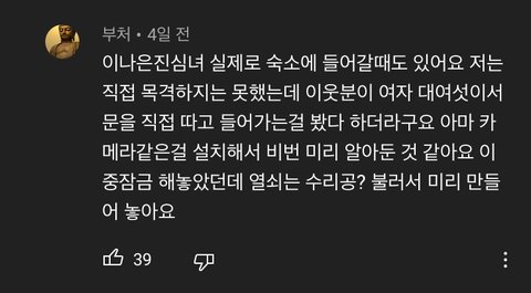 근데 사생옹호하는거 절대아니고. 너넨 저 인증하나없는글을 믿어? 번호누르고 들어가는거 는 집앞에 서서기다리는거보다 명확하게 주거침입죄로 바로 경찰서갈텐데 설마 그러겠냐 본문 걍 사실도있겠지만 뻥튀기한거같은데