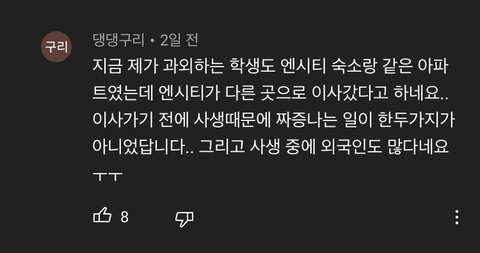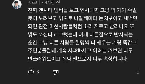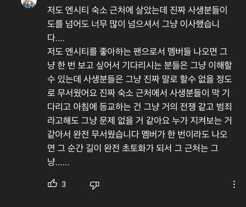 ㅇㅇ 실화임 나 실제로 근처 사는데 차 타고 지나갈 때마다 거의 집 앞에 10명 이상 서 있어 내가 엔시티 입덕한지는 얼마 안 됐는데 내가 정프이기 때문에 그 집이 127 숙소라는 거 듣자마자 빡쳐서 대가리 ㅈㄴ 깼음 그래서 지나가면서 사생들 사진 찍은 적 있는데 찰칵 소리 나자마자 우르르 쳐다봐서 웃프지만 튀었어 사실,, 플 타면 안 좋을 것 같아서 그동안 얘기 안 했는데 글 올라왔으니까 말할게 사진이 아무리 예뻐도 사생 진짜 소비 안 했으면 좋겠어