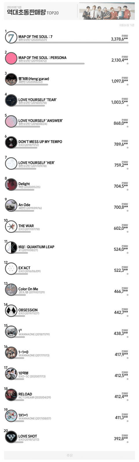 역대 아이돌 초동 판매량 TOP 20