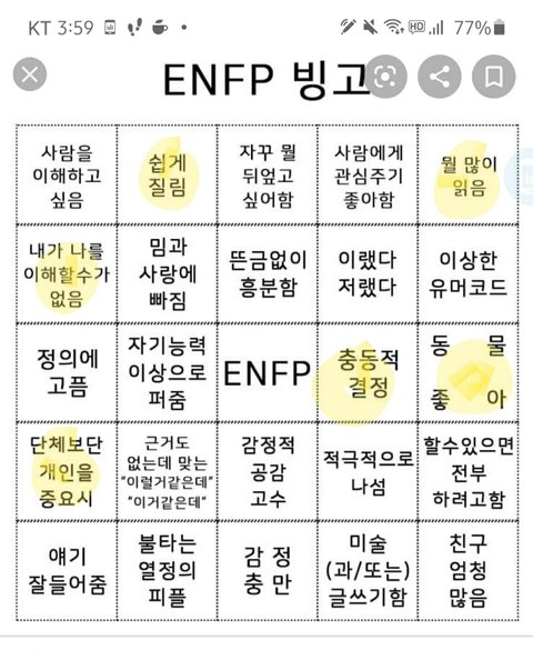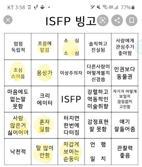 나 mbti빙고 해봤는데 내 mbti뭔지 맞춰봐