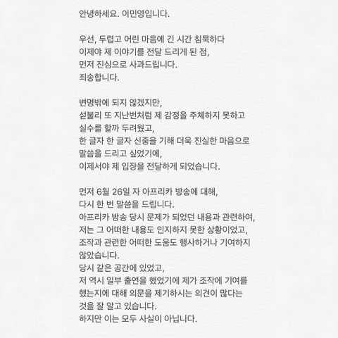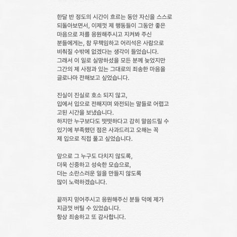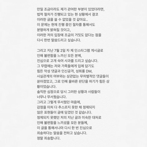 사건터질때도 말로만 사과문이였고 자신에 대한 비난을 고소하겠다는 내용이 주내용이였음