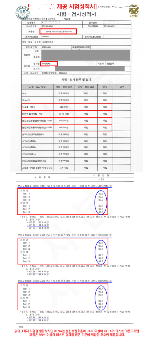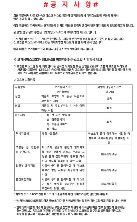 우선 KF-AD는 비말 차단용 마스크로 나왔기 때문에 액체 저항성 테스트가 필수지만 KF94와 KF80은 액체 저항성 테스트가 필수가 아니라는 입장입니다. 그러므로 액체가 저렇게 흘러도 업체는 불량이 아니라고 주장할 수 있는 겁니다.