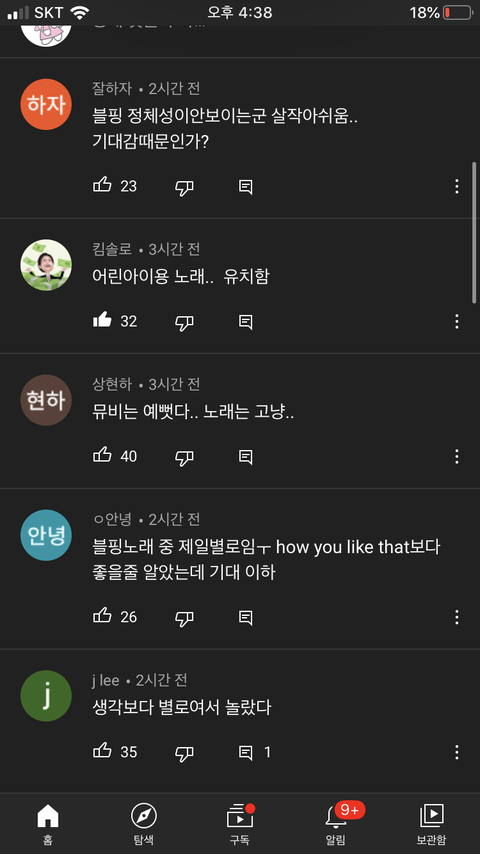 물타기도 없진 않겠지 머 ㅋㅋㅋㅋㅋ 초딩천국 유튭에서 무슨 '블핑 노래 현실반응' ㅇㅈㄹㅋㅋㅋ난 좋던데 왜 자꾸 별로렝 ㅠㅠㅠㅠ