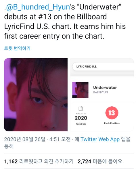 백현이 bill보1드 가사 찾기 차트에 안다와타 13위로 올라왔디야