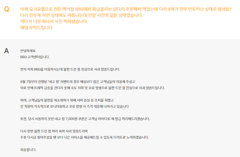 BBQ에서 주문해서 먹은 닭다리 상태가 안좋아서 문의글을 올렸는데 왜 저런 답변이 달리는지 모르겠네요.