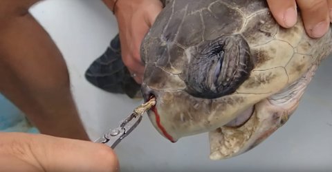(사진:플라스틱 빨대가 거북이 코에 들어가서 빼주는 상황)