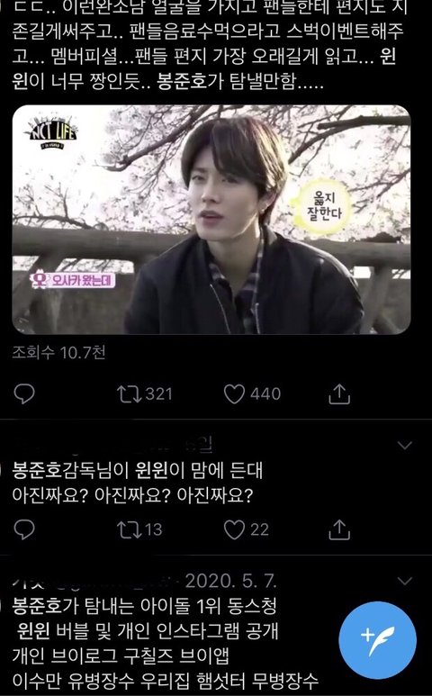 짹 보다가 윈윈 영상에 역시 봉1준1호가 탐내는 아이돌답다 그러길래 윈윈 ㅂㅈㅎ 쳐봤거든 이런거 나오는데 ㅂㅈㅎ감독님이 윈윈이 언급한 적 있어??
