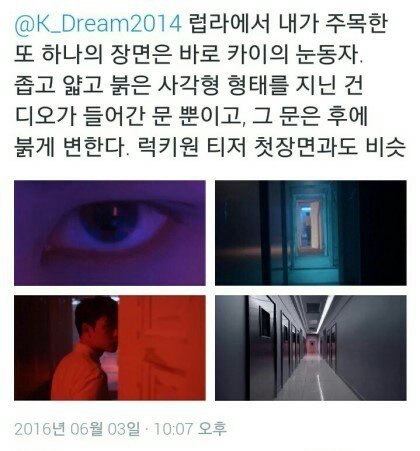 럽라 뮤비(2015) 속 카이의 눈동자에 비치는 눈은