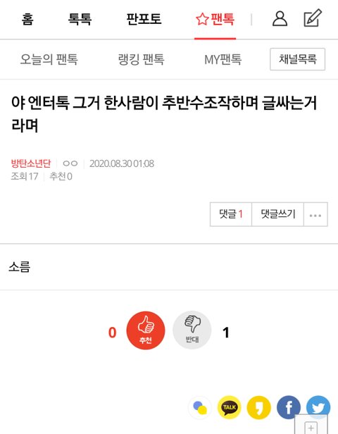야 엔터톡 그거 한사람이 추반수조작하며 글싸는거라며
