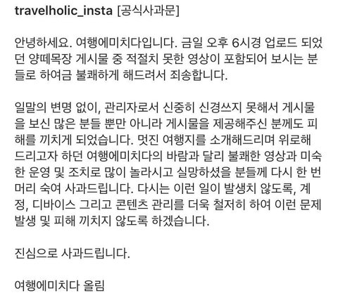 29일 오후 강원도 평창의 양떼목장을 소개하는 글과 함께 올린 사진 중 성관계 영상이 포함돼 있었고 급하게 게시물을 삭제했지만 네티즌들이 다른 게시물에 해명을 요구하며 분노가 커지자 네 시간 만에 사과문 업로드.