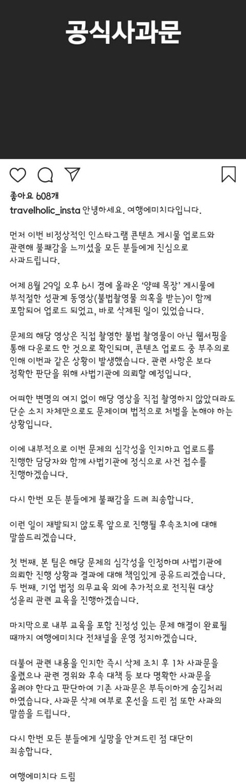 인스타그램에서 '여행에 미치다' 라는 무려 125만명의 팔로워를 가진 여행 공식 채널이 불법촬영물로 추정되는 영상을 올리는 사건이 일어남.